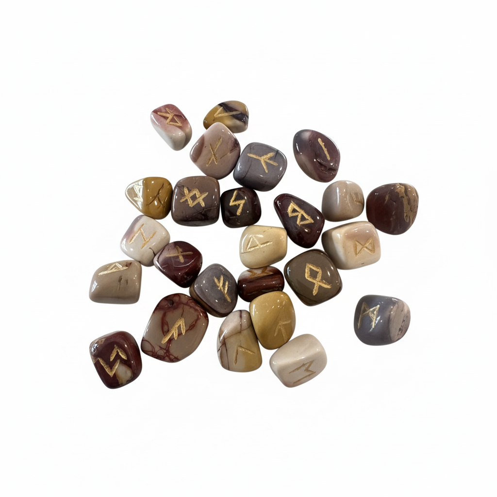 - 25 hand-carved Mookaite Jasper rune stones with gold symbols
